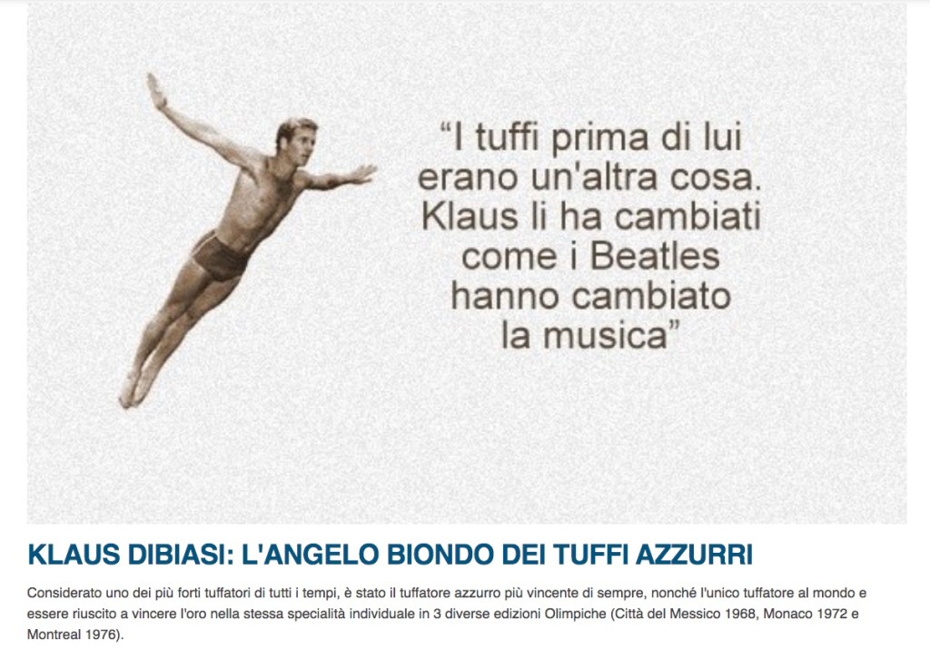 “Klaus ha cominciato a 10 anni e si è tuffato oltre 10mila volte. Nel 1968 ha 19 anni, vince l’oro a Città del Messico e in un colpo solo porta a casa 1 milione di lire dal Coni, una 500 in dono dalla Fiat e finalmente la costruzione di una piscina coperta a Bolzano.”