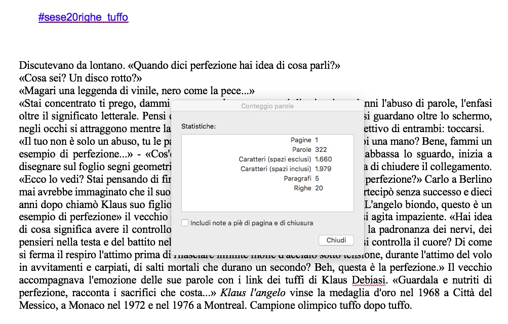 «Hai idea di cosa significa avere il controllo di ogni muscolo, di ogni legamento, avere la padronanza dei nervi, dei pensieri nella testa e del battito nel petto che ingurgita aria? Hai idea di come si controlla il cuore? Di come si ferma il respiro l’attimo prima di rilasciare infinite molle d’acciaio sotto tensione, durante l’attimo del volo in avvitamenti e carpiati, di salti mortali che durano un secondo? Beh, questa è la perfezione…» condividendo le finestre del computer nella call di lavoro, il vecchio accompagna l’emozione delle sue parole con i video dei tuffi di Klaus Debiasi.