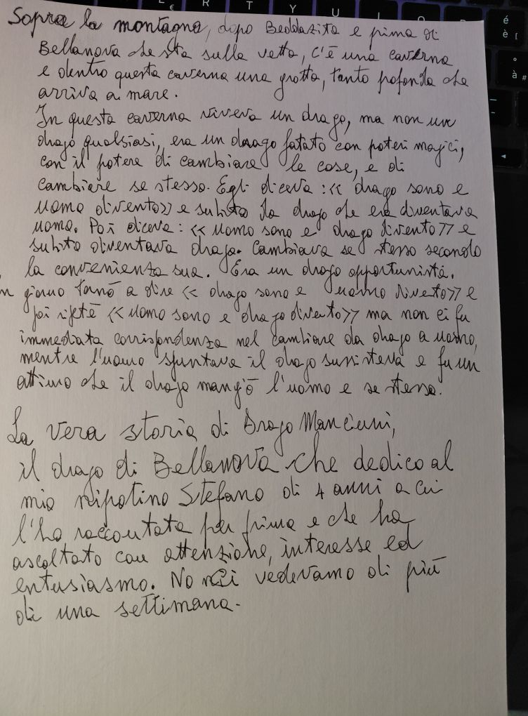 Ma drago manciuni non era un drago qualsiasi, come ce n’erano tanti a quei tempi, era un drago fatato con poteri magici. Aveva, questo drago, il potere di cambiare le cose, anche sé stesso. Egli diceva: “drago sono e uomo divento” e immediatamente diventava uomo da drago che era. Poi diceva :” uomo sono e drago divento” e subito tornava ad essere drago. Un giorno che tardò a svanire come drago mentre comparviva come uomo, e si videro in faccia drago e uomo, fu un attimo, il drago divorò l’uomo e sé stesso.